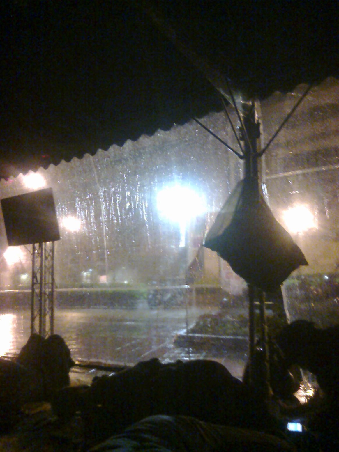 凌晨 04:20 左右 棚頂的引水管(塑膠布製)支撐不住噴水出來...圖為工作人員前來處理