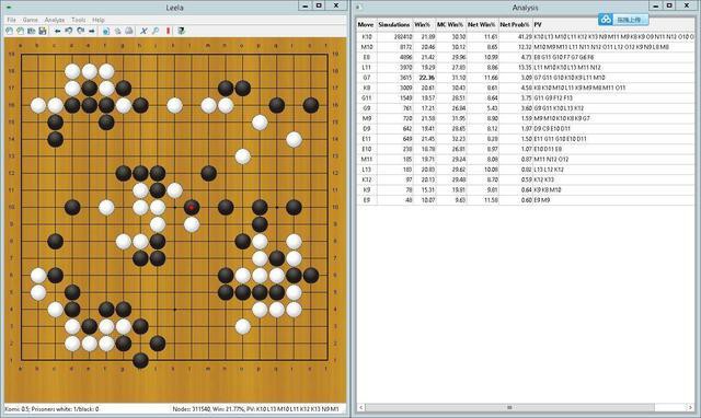 本圖黑棋右邊先手打散白棋可能存在的陣勢,處理的也很簡明此時它MC判斷白棋三四成勝
