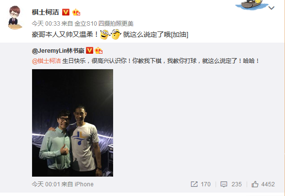 8月3日淩晨,著名籃球運動員林書豪發微博@棋士柯潔 生日快樂,很高興認識你!你教